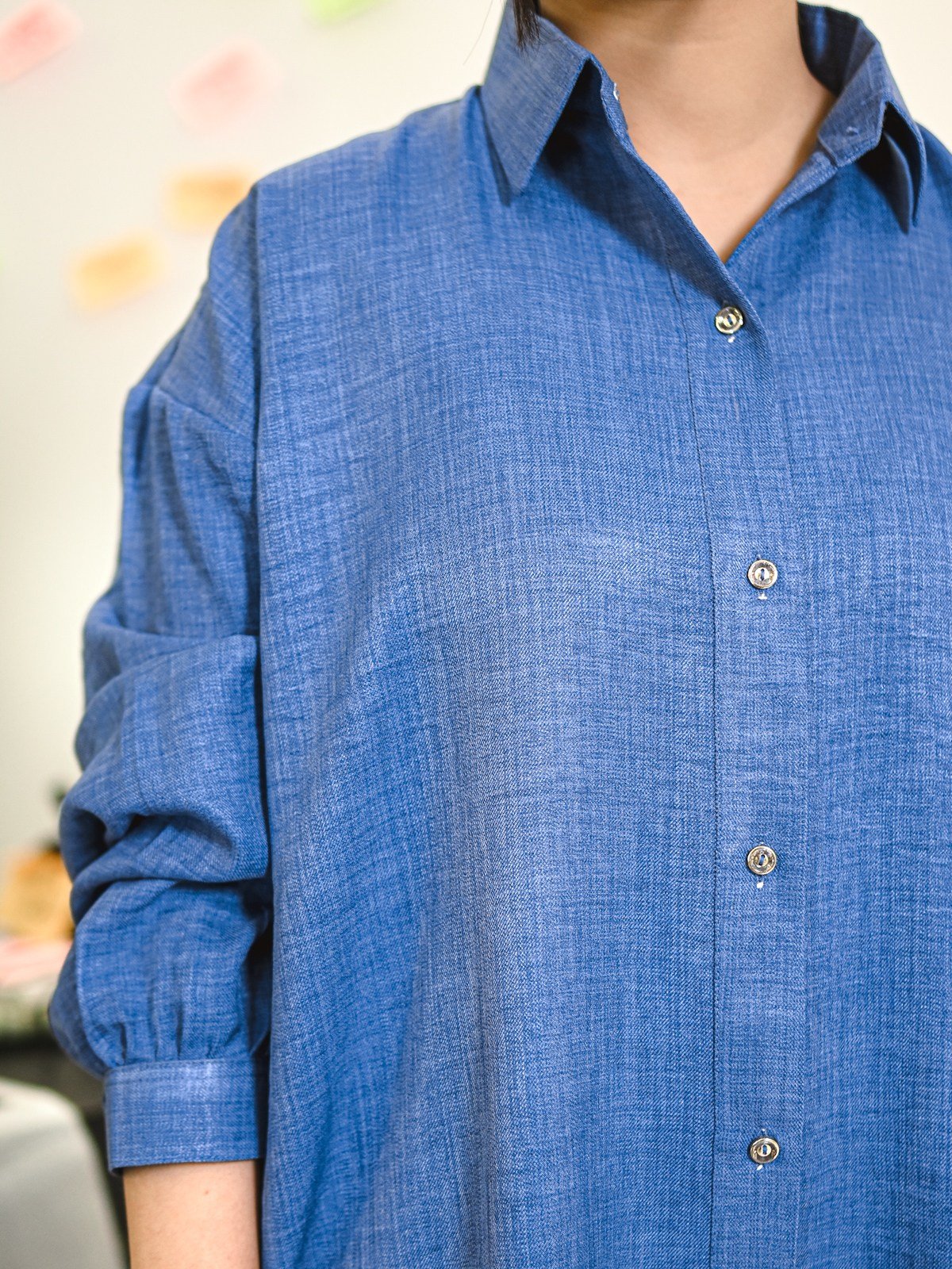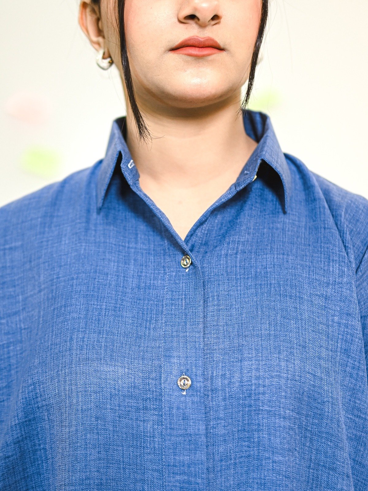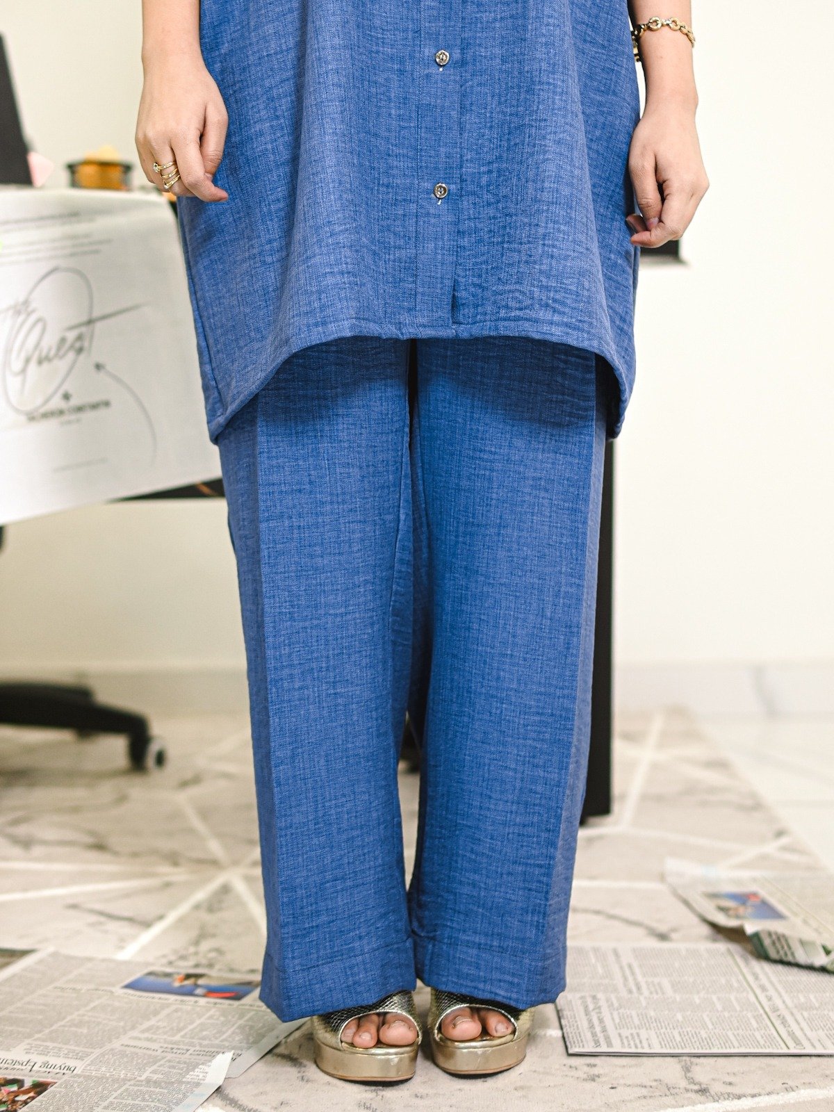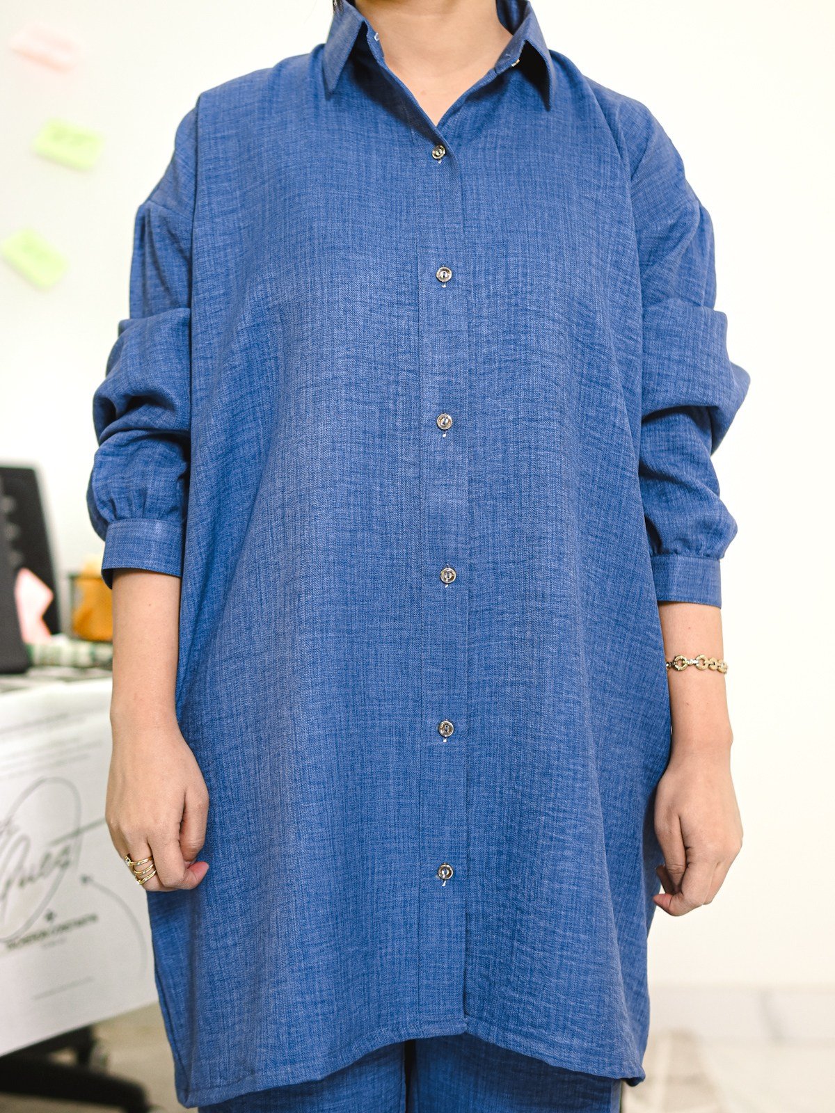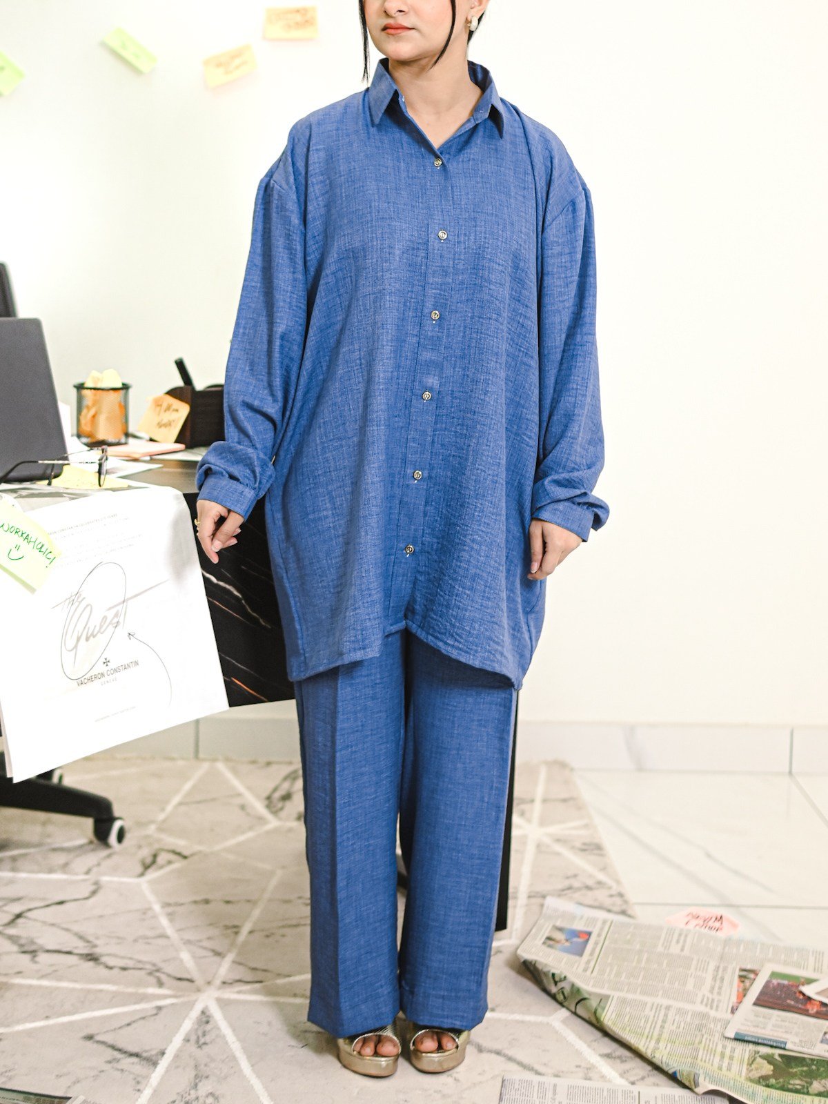 A deep-azure blue two-piece set featuring a textured marina shirt and matching trousers, tailored for a clean and composed workwear style.