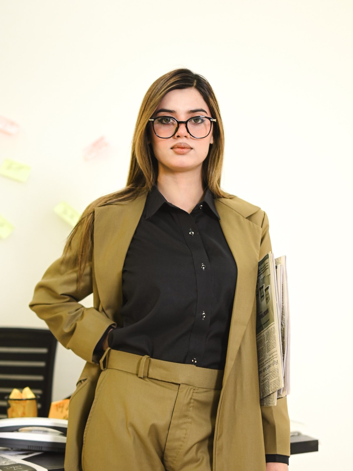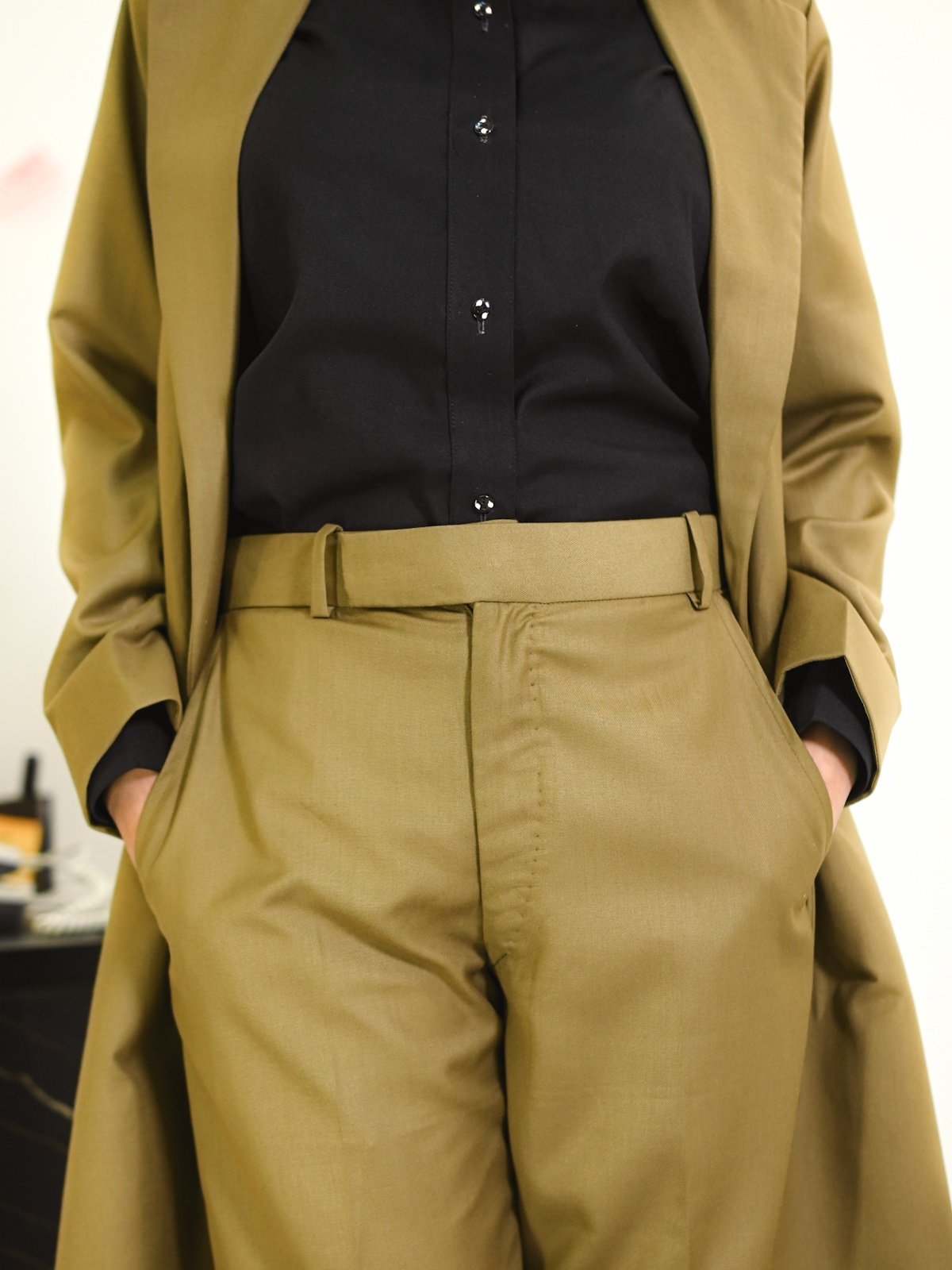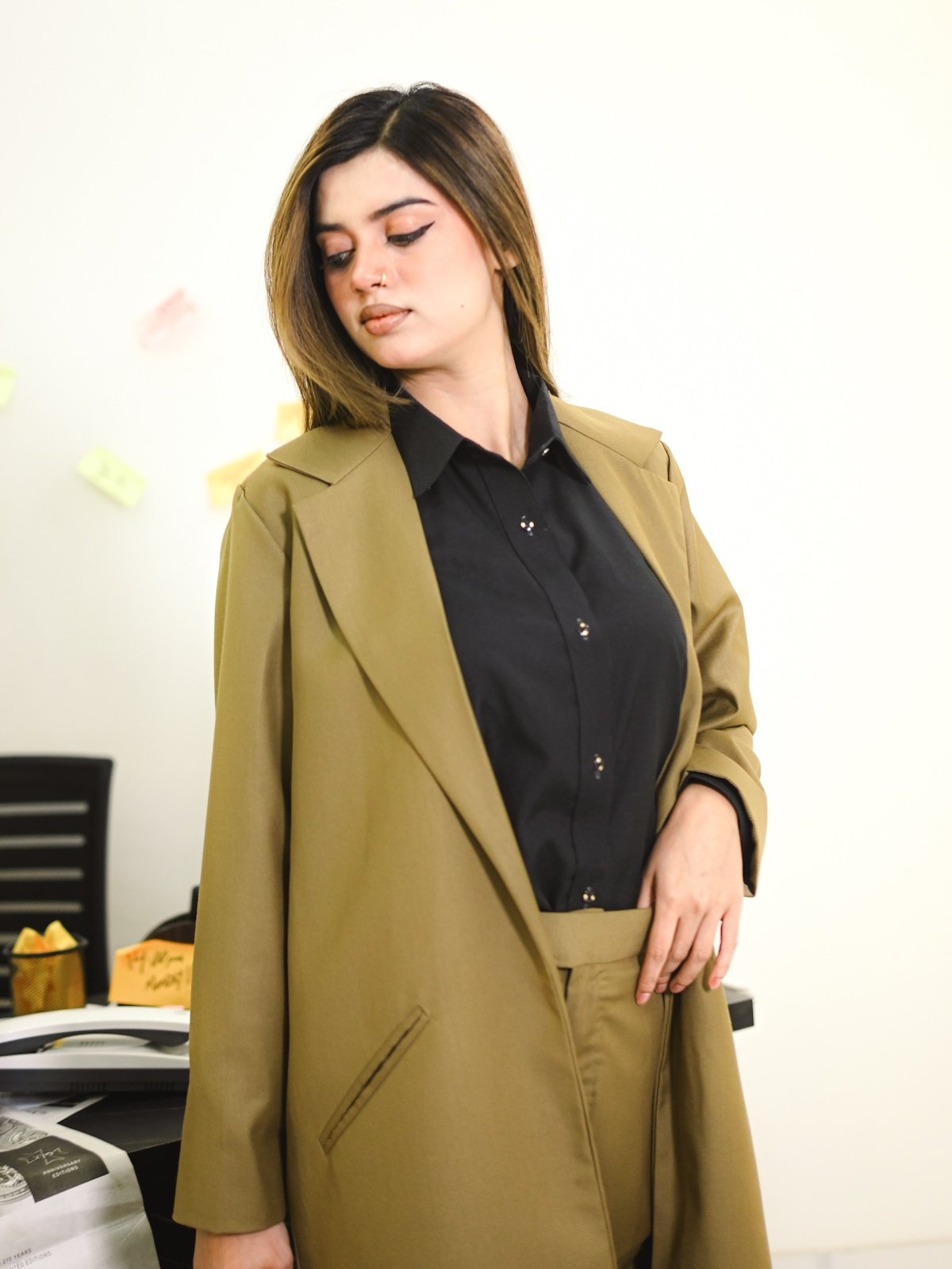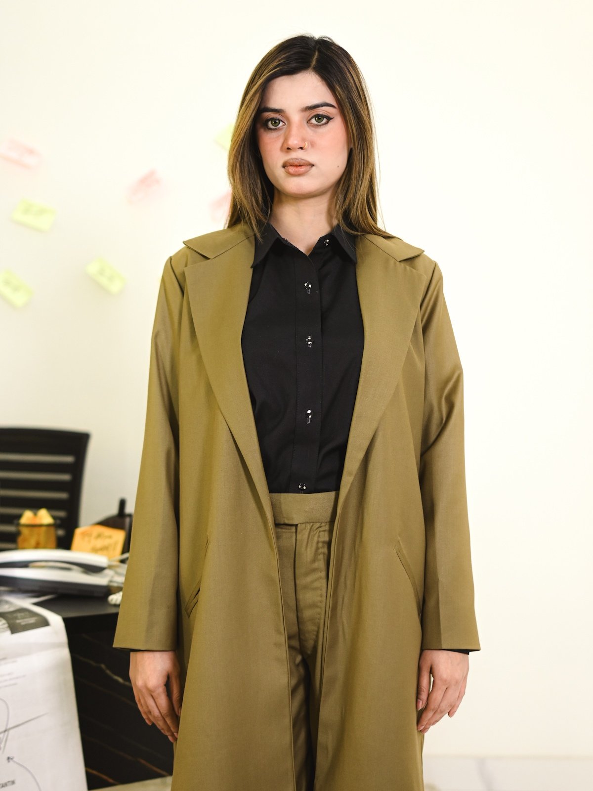 A rich camel-brown tweed trench suit featuring a tailored trench coat, matching pants, and an inner shirt, perfect for polished winter sophistication.