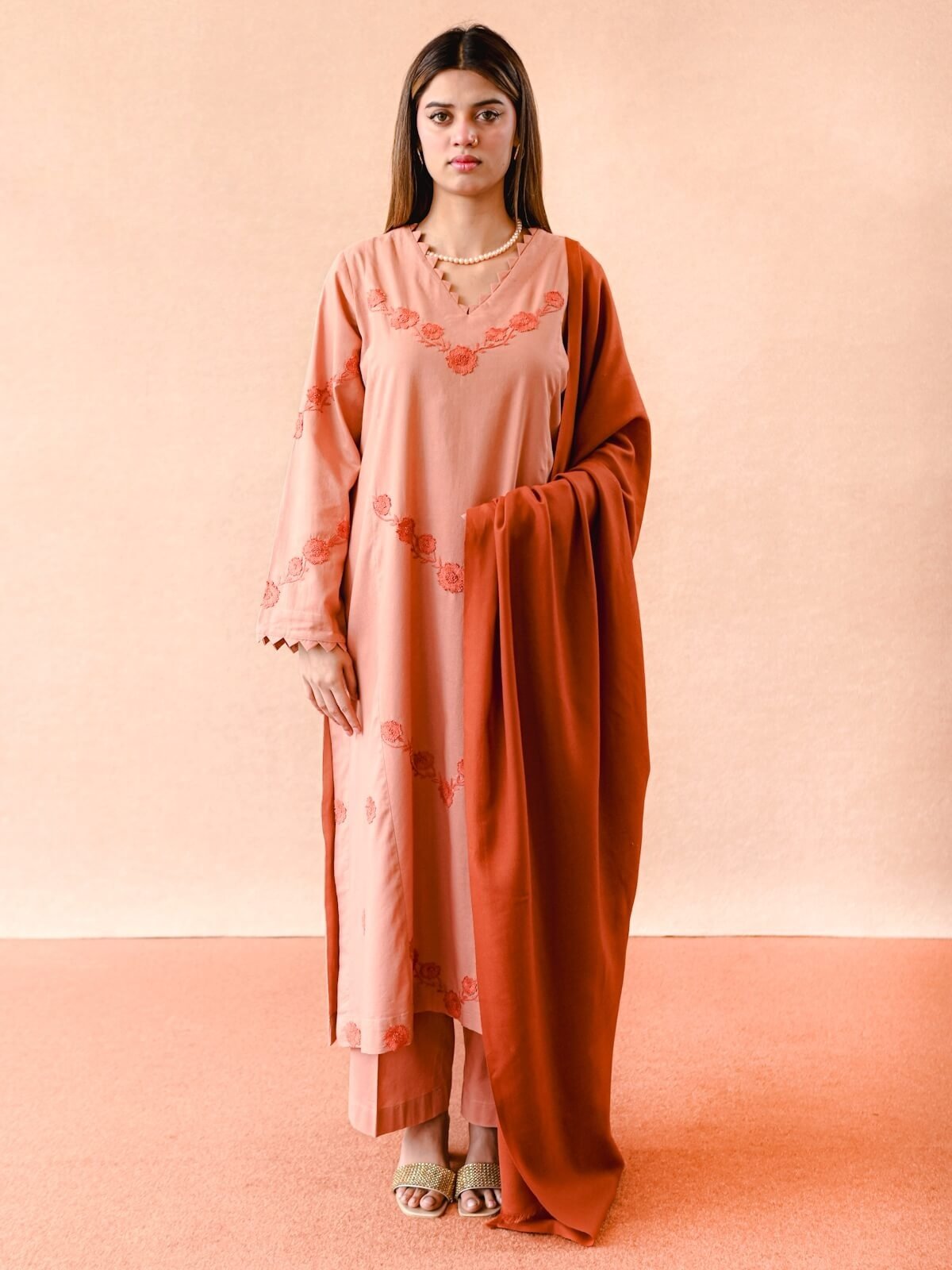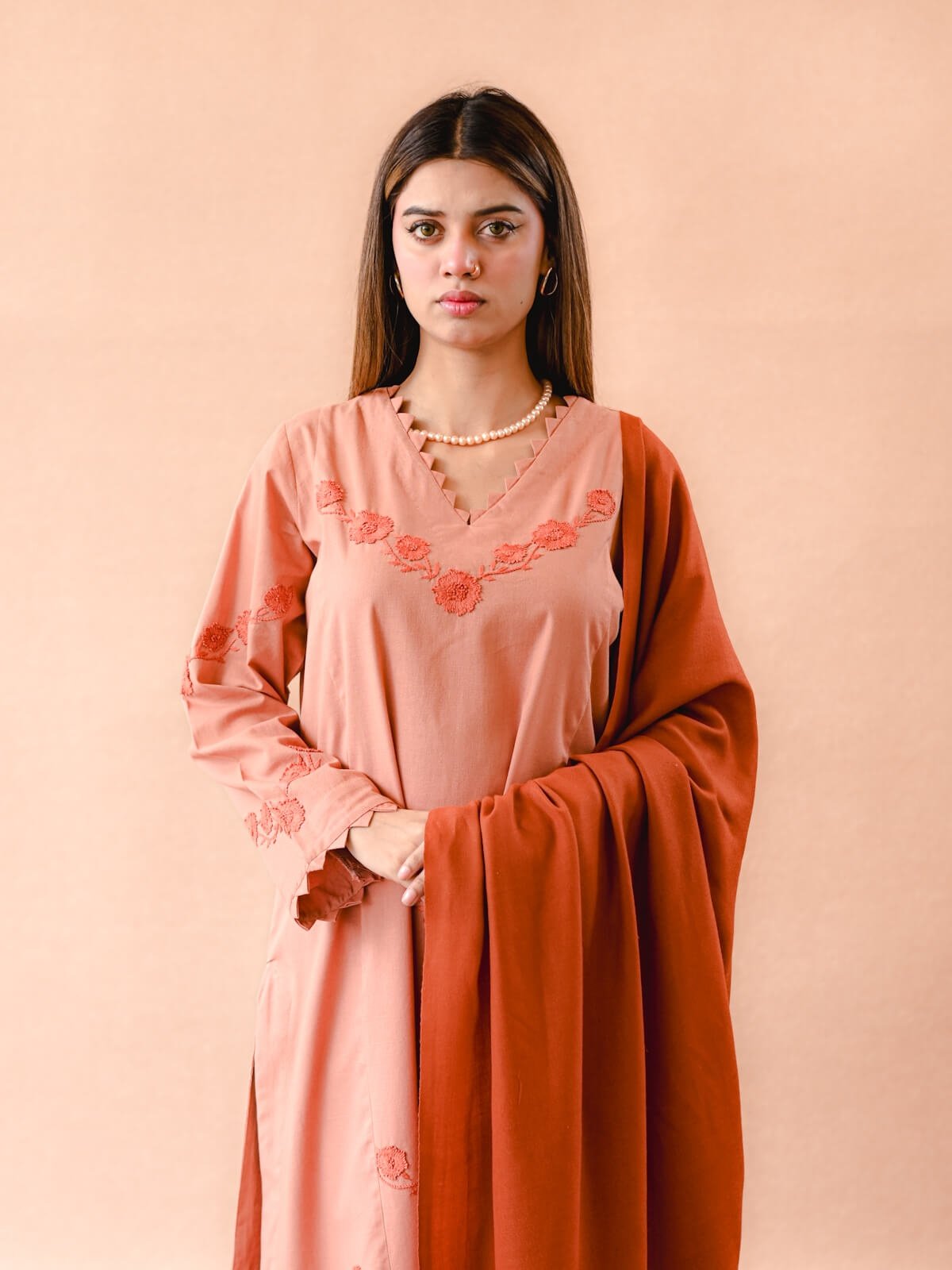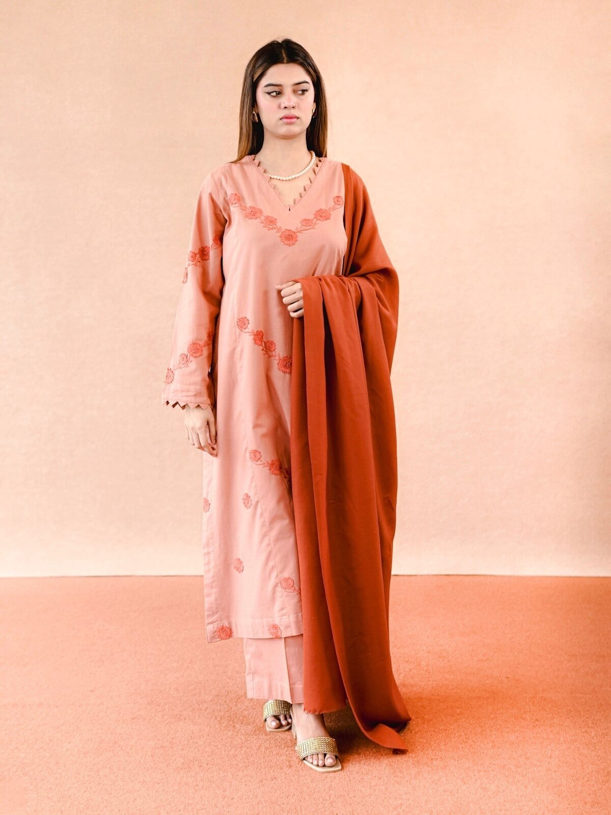 Plain Khaddar shirt with dark peach beautiful handmade embroidery on the shirt, paired with plain trouser and a dark peach wool shawl.