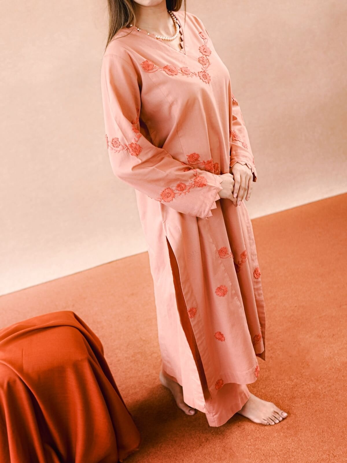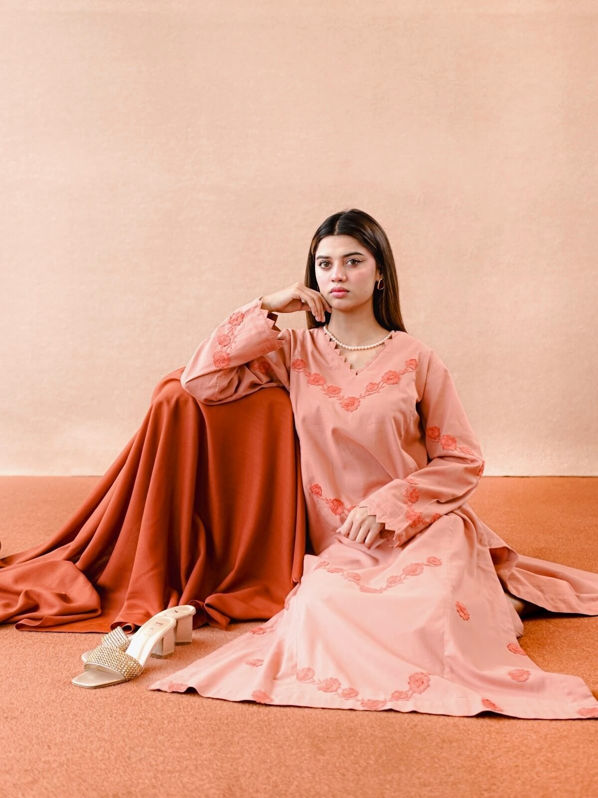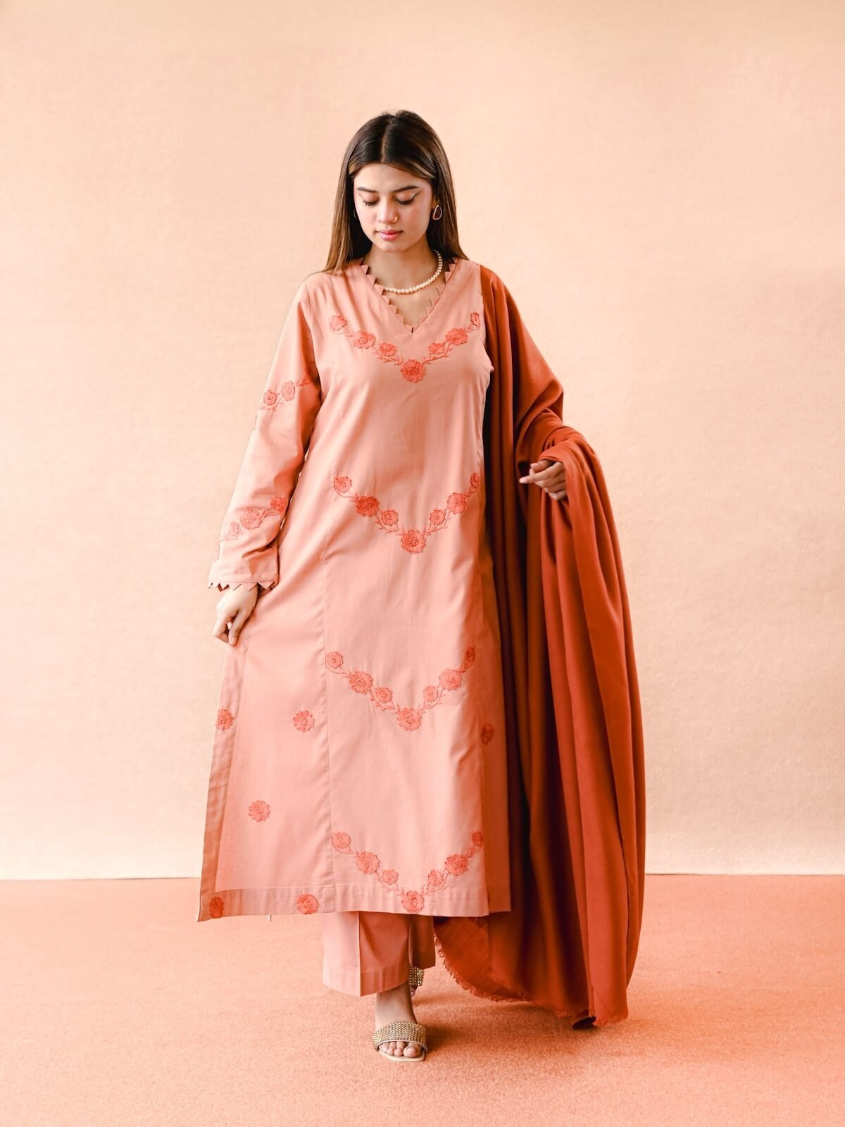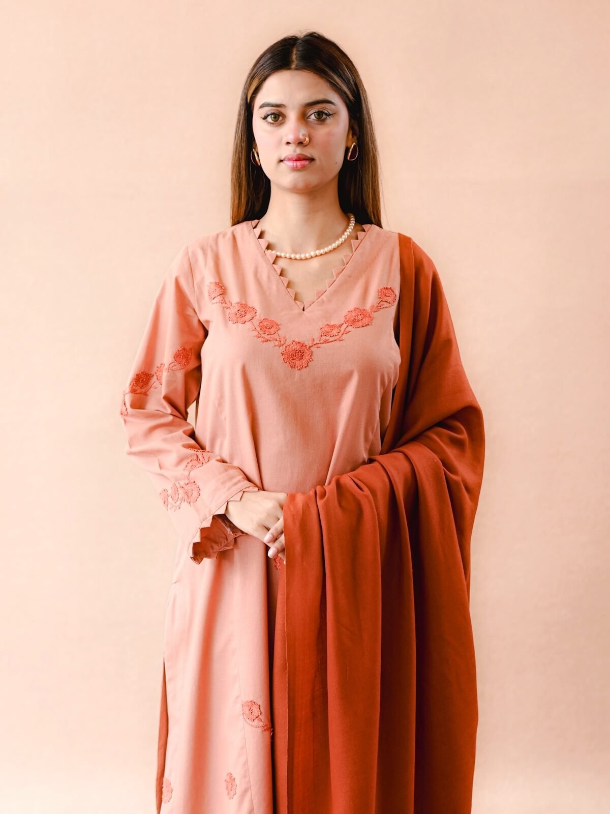 Plain Khaddar shirt with dark peach beautiful handmade embroidery on the shirt, paired with plain trouser and a dark peach wool shawl.