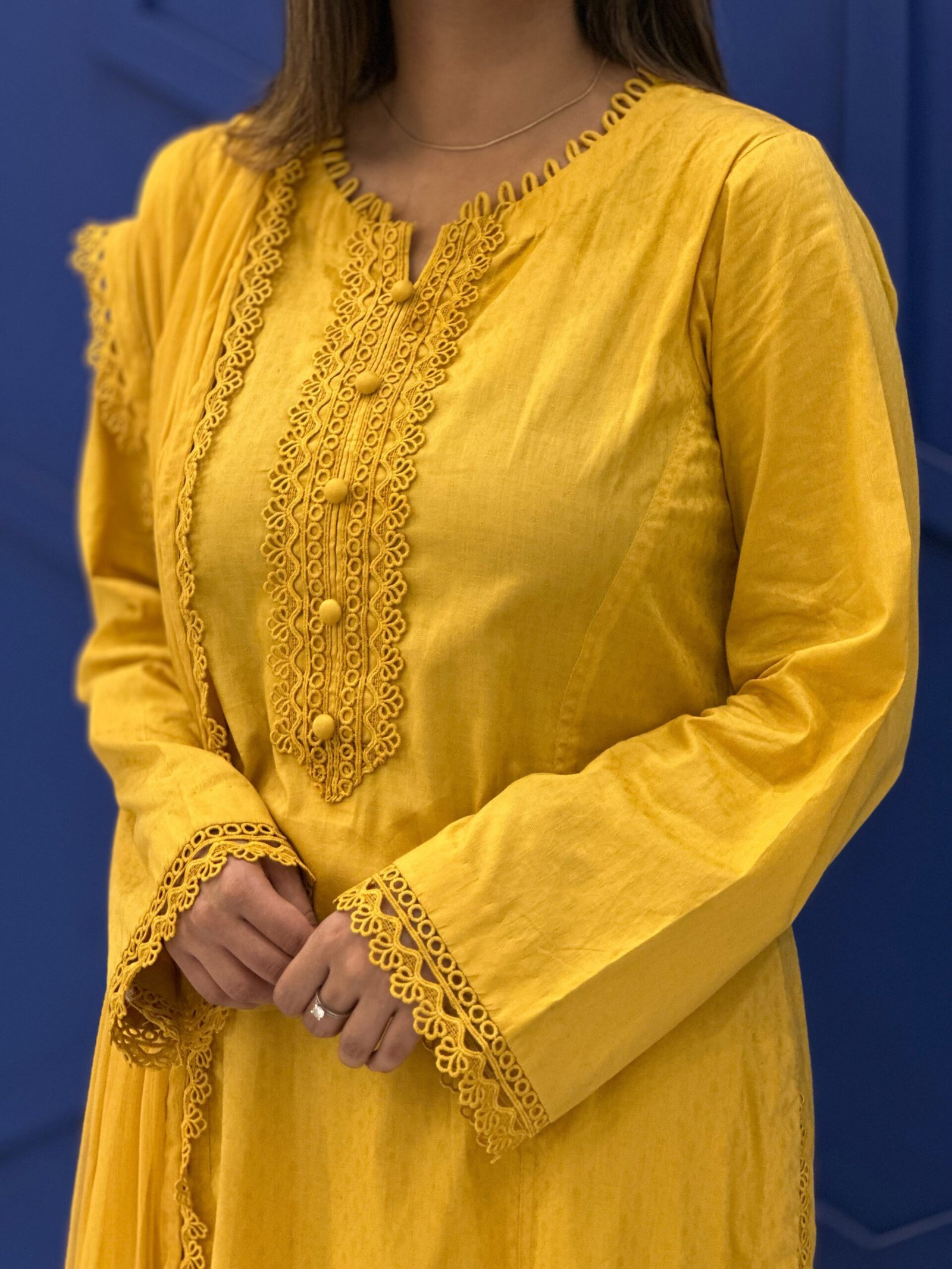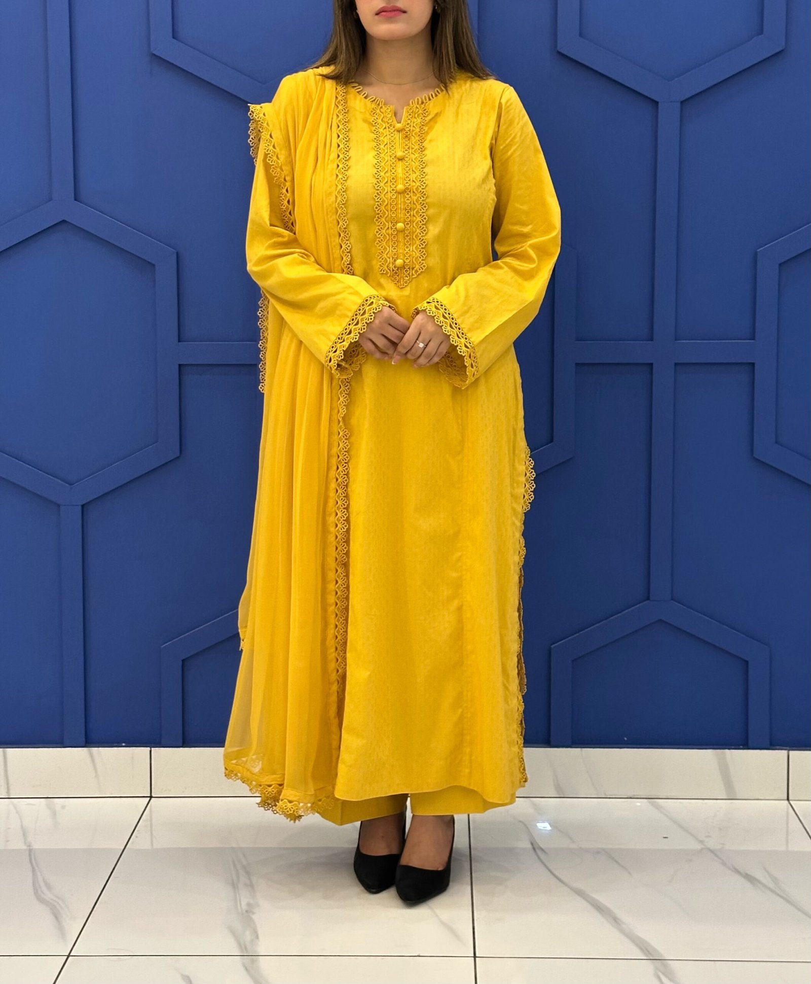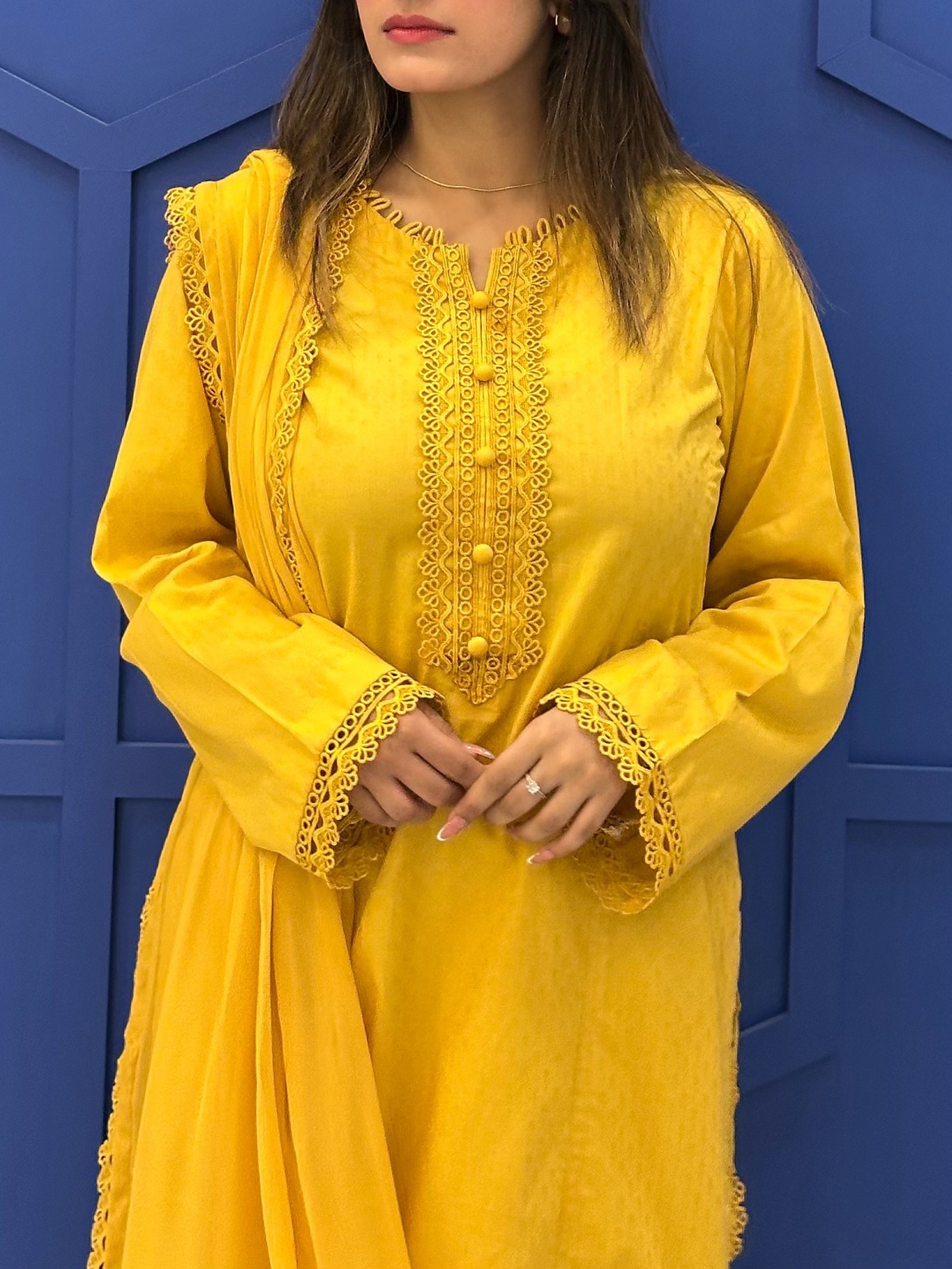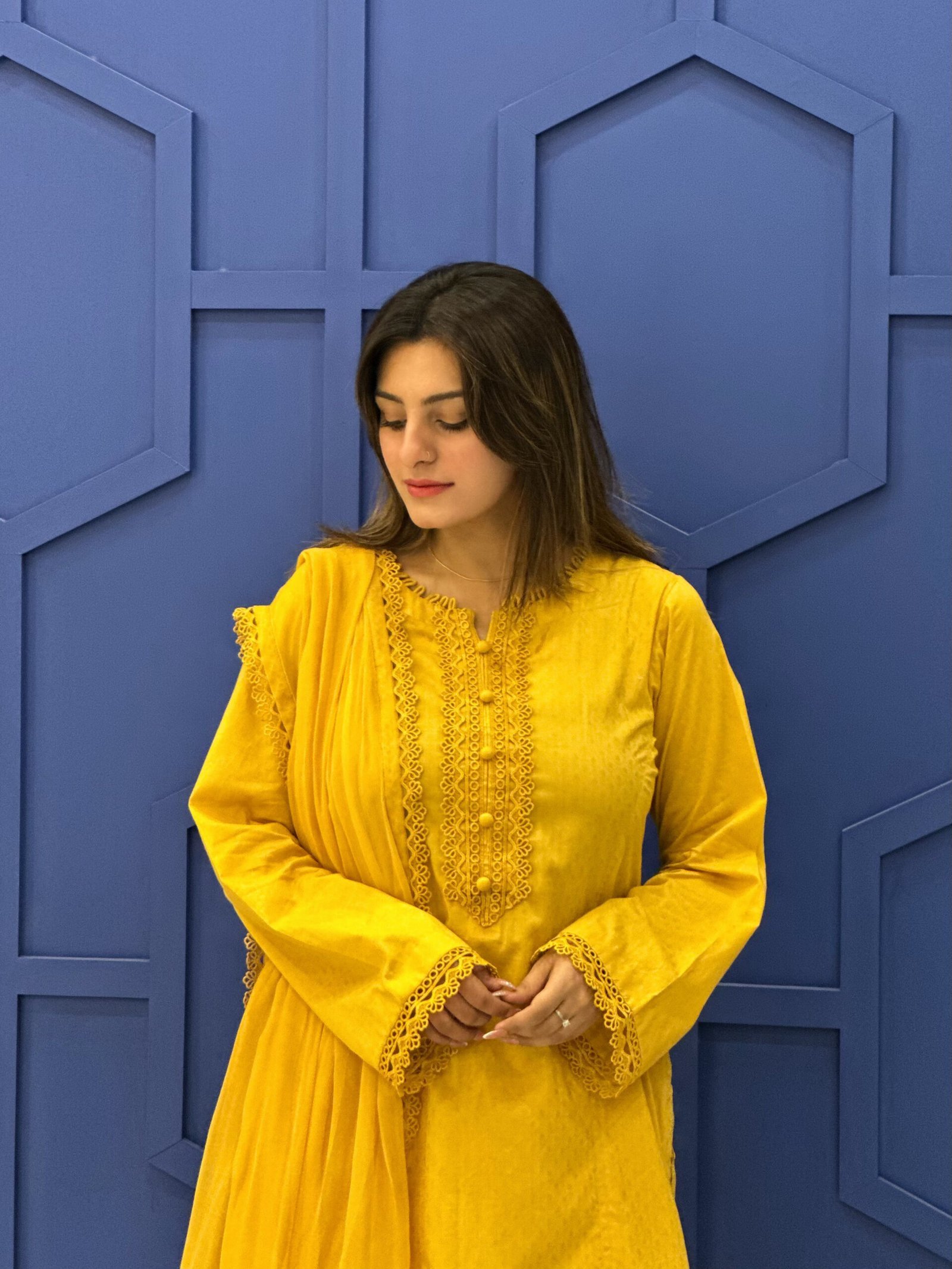 Make a truly elegant statement in this embroidered three-piece suit from the latest Mehr-e-Noor collection.