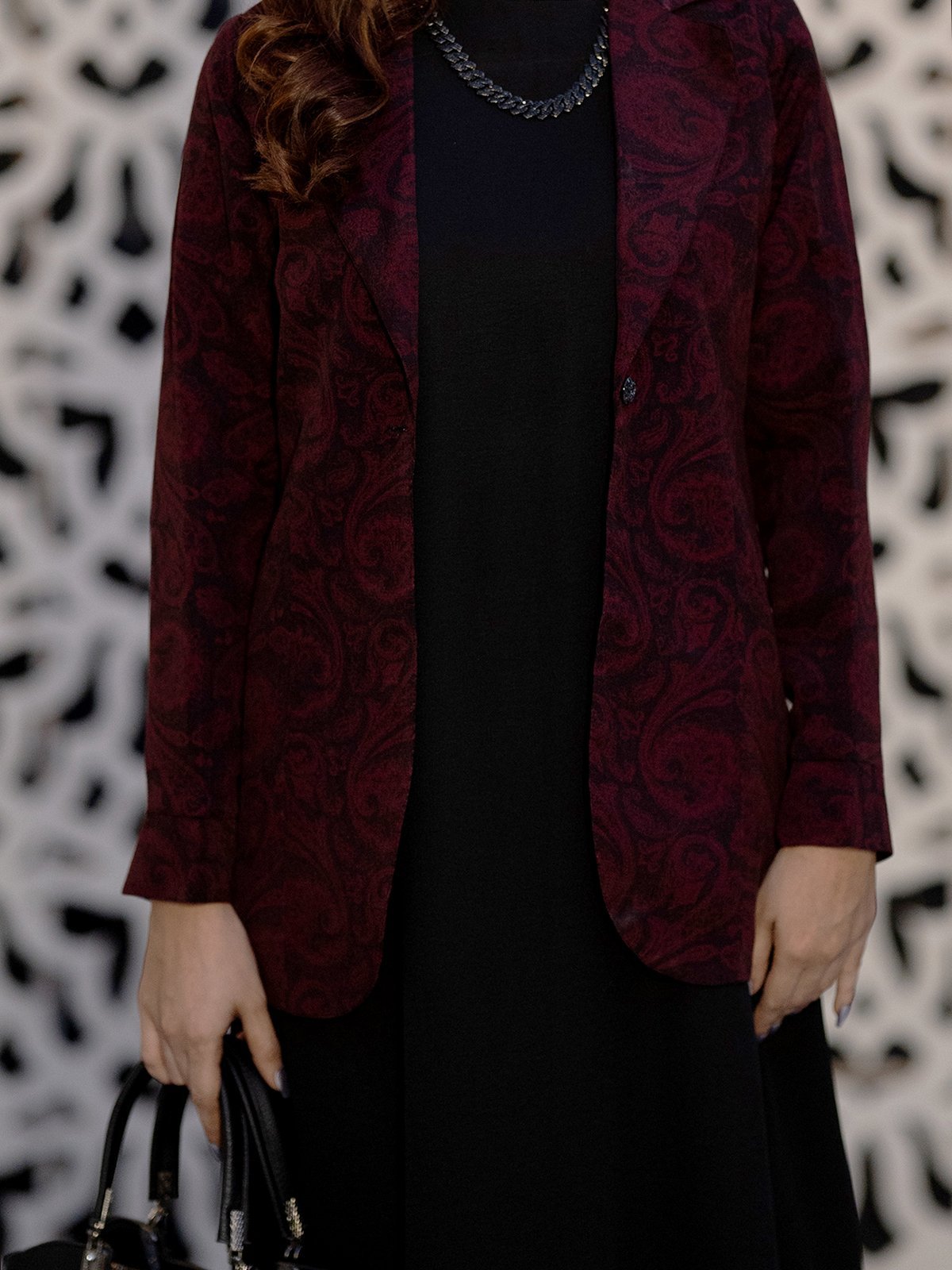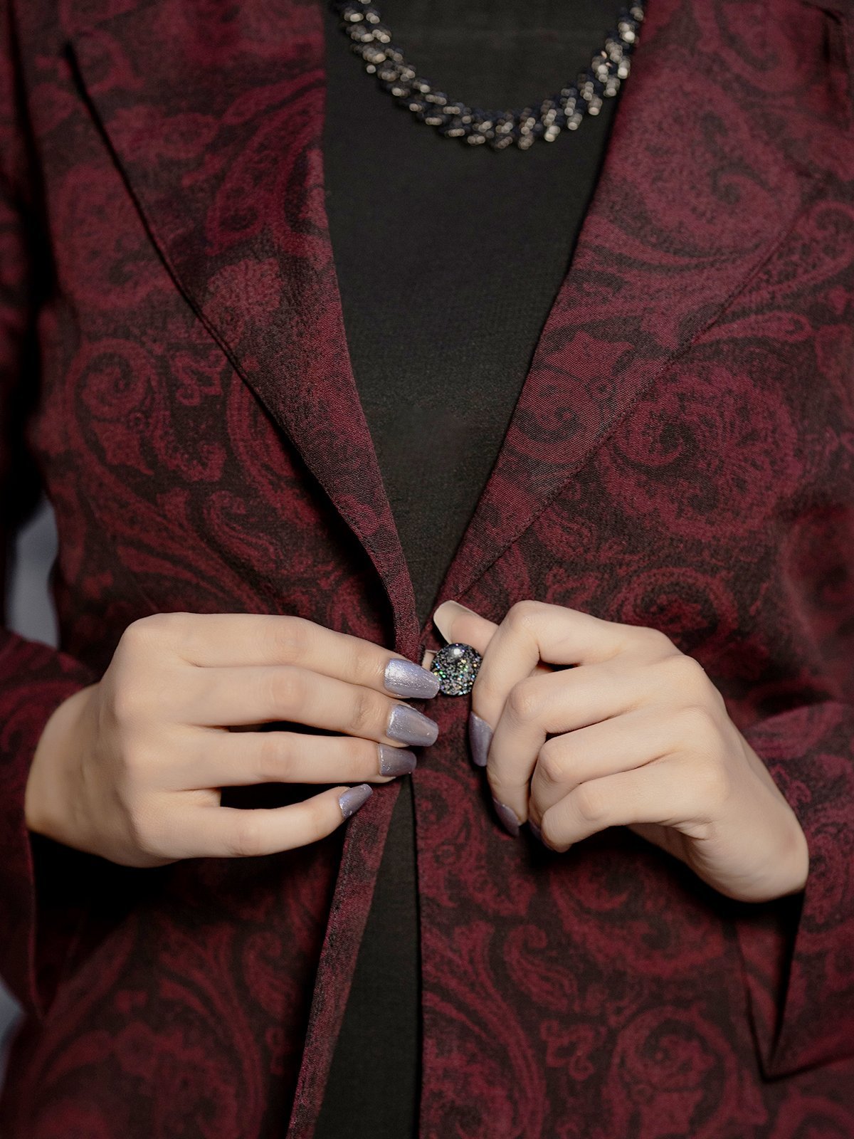Description: Black long shirt and pants styled with a maroon paisley Blazer. Polished, authoritative, and perfect for conferences or panels.